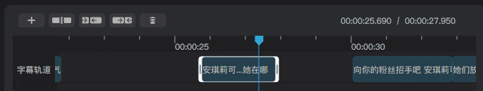 如果字幕的时间有误,您还可以点击拖动整个字幕块或字幕块左右两边的手柄,来调整字幕的出现时间和结束时间。