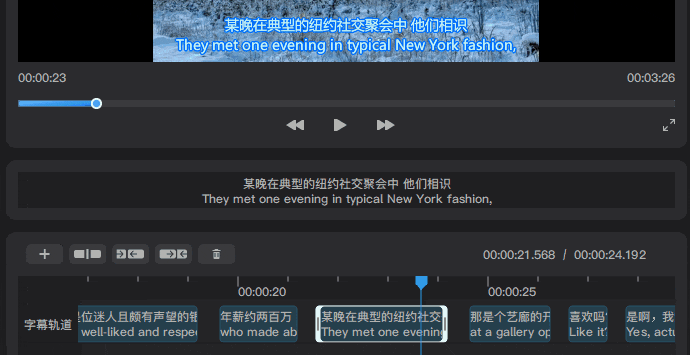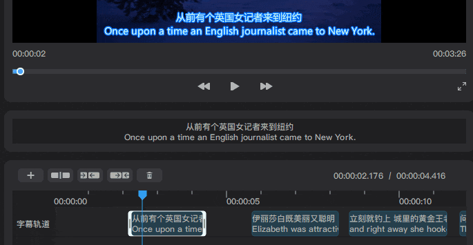 拆分双语或多语字幕:点击选择字幕块后,和拆分单语字幕一样将第一行(第一种语言)的字幕内容拆分,字幕块一分为二后再手动校正两个字幕块中第二行(第二种语言)的字幕内容。